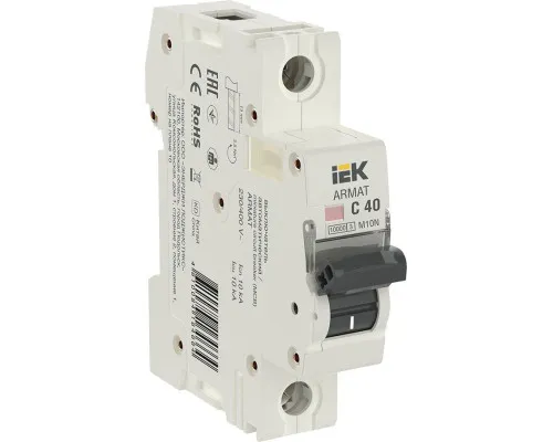 Subheading: Circuit breaker Manufacturer's article: AR-M10N-1-C040 Functionality: Short description: Modular for DIN-rail ARMAT series, 1-pole, rated. off capacity 10 kA, I-nom. 40A, U-nom. 230…400 V, IP20, t-work.-40...+70