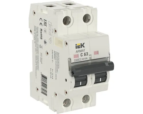 Subheading: Circuit breaker Manufacturer's article: AR-M10N-2-C063 Function: Short description: Modular for DIN-rail ARMAT series, 2-pole, rated. off capacity 10 kA, I-nom. 63А, U-nom. 230…400 V, IP20, t-work.-40...+70°C, c