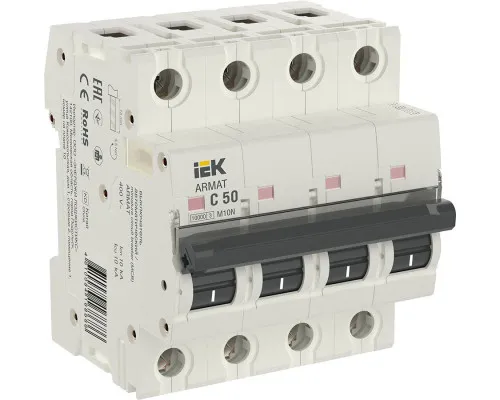 Subheading: Circuit breaker Manufacturer's article: AR-M10N-4-C050 Functionality: Short description: Modular for DIN-rail ARMAT series, 4-pole, rated. off capacity 10 kA, I-nom. 50A, U-nom. 230…400 V, IP20, t-work.-40...+70